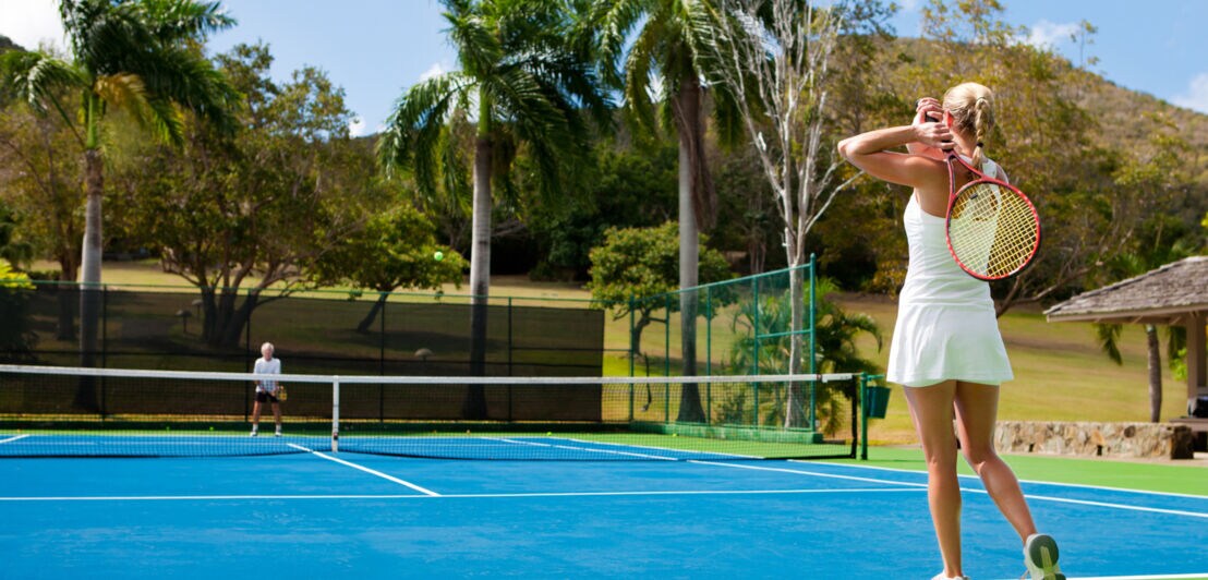 Zwei Personen spielen auf einem sonnigen Platz umgeben von Palmen Tennis.
