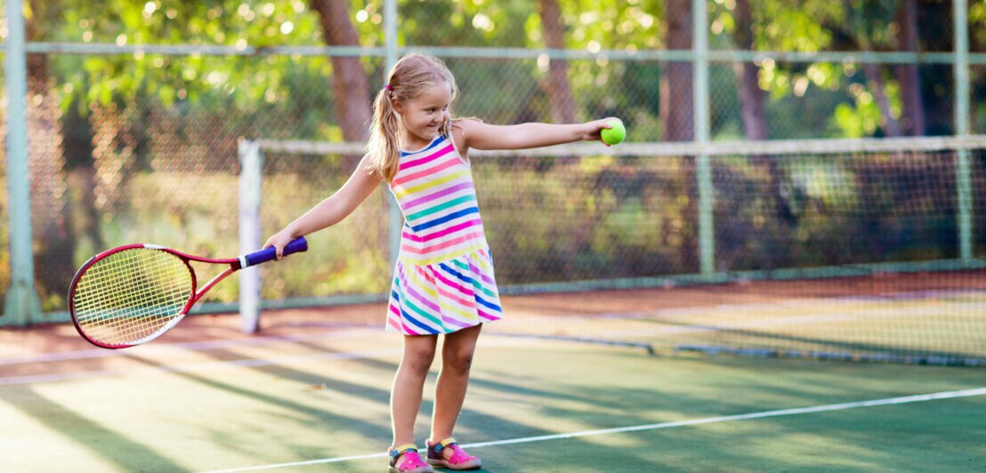 Ein kleines Kind im bunt gestreiften Kleid steht auf einem Tennisplatz und hält in der einen Hand einen Tennisschläger und in der anderen einen Tennisball.
