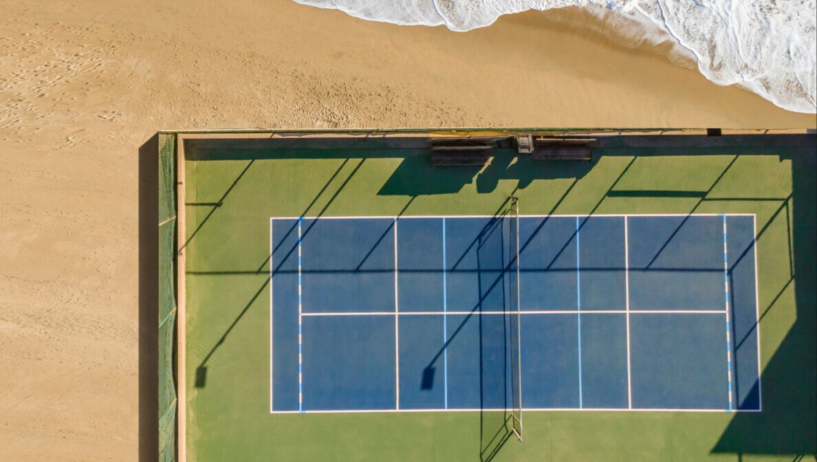 Drohnenansicht des Tennisplatzes am Sand und Meer.