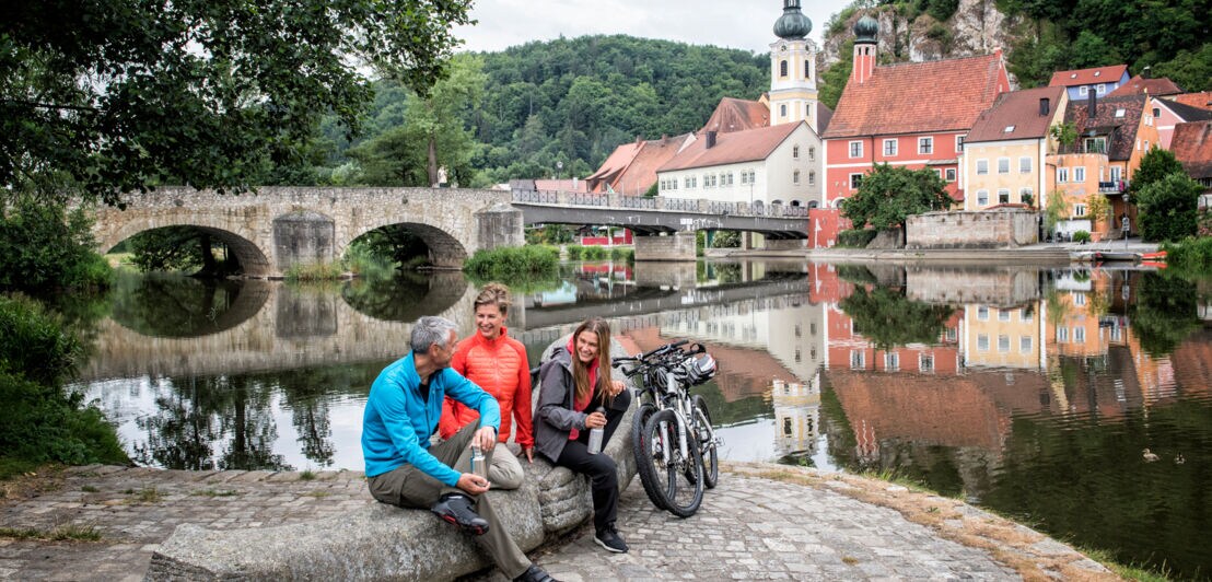 Drei Personen mit Fahrrädern sitzen auf einem Stein am Ufer eines Flusses vor dem Panorama einer mittelalterlichen Kleinstadt.
