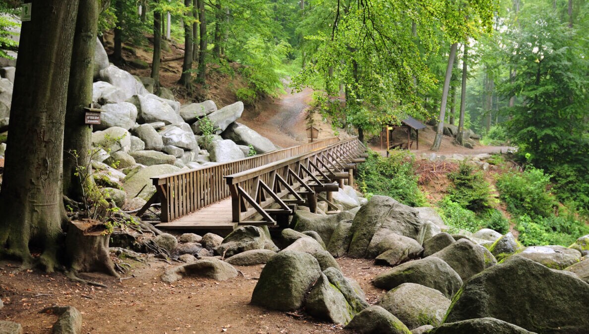 Holzsteg über Felsen im Naturpark Bergstraße-Odenwald