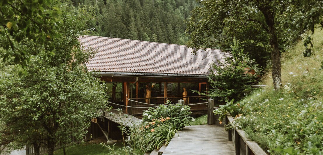 Ein Haus mitten im Grünen, zu dem ein Holzsteg führt.