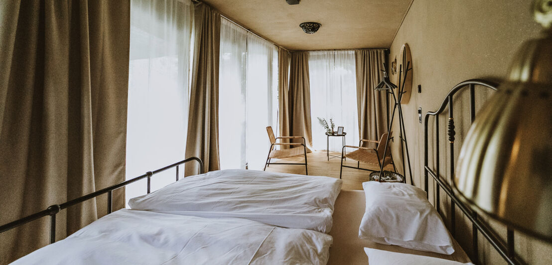 Blick in ein Hotelzimmer mit Doppelbett und zwei Stühlen.