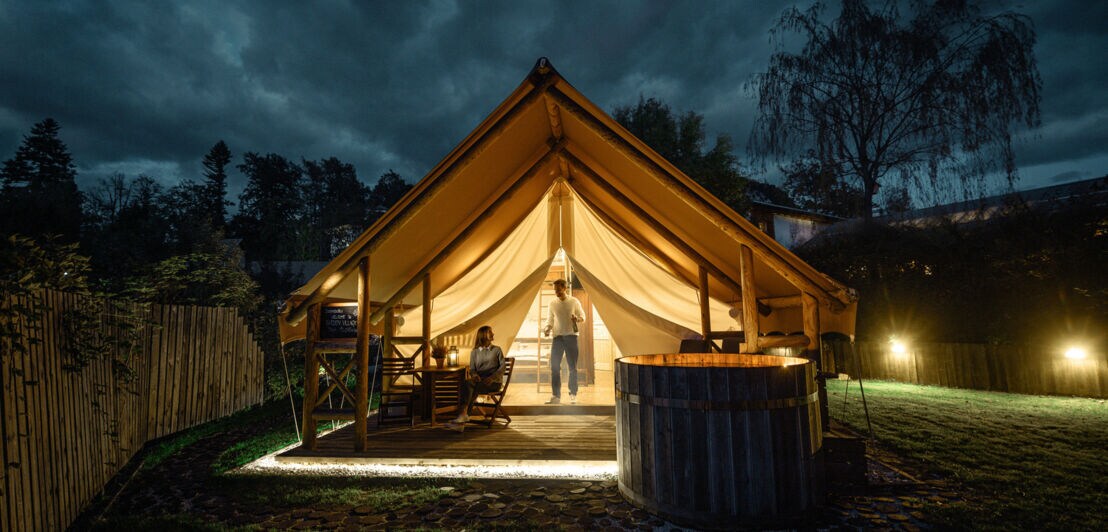 Ein stabiles, luxuriöses Zelt, das bei Nacht beleuchtet wird.