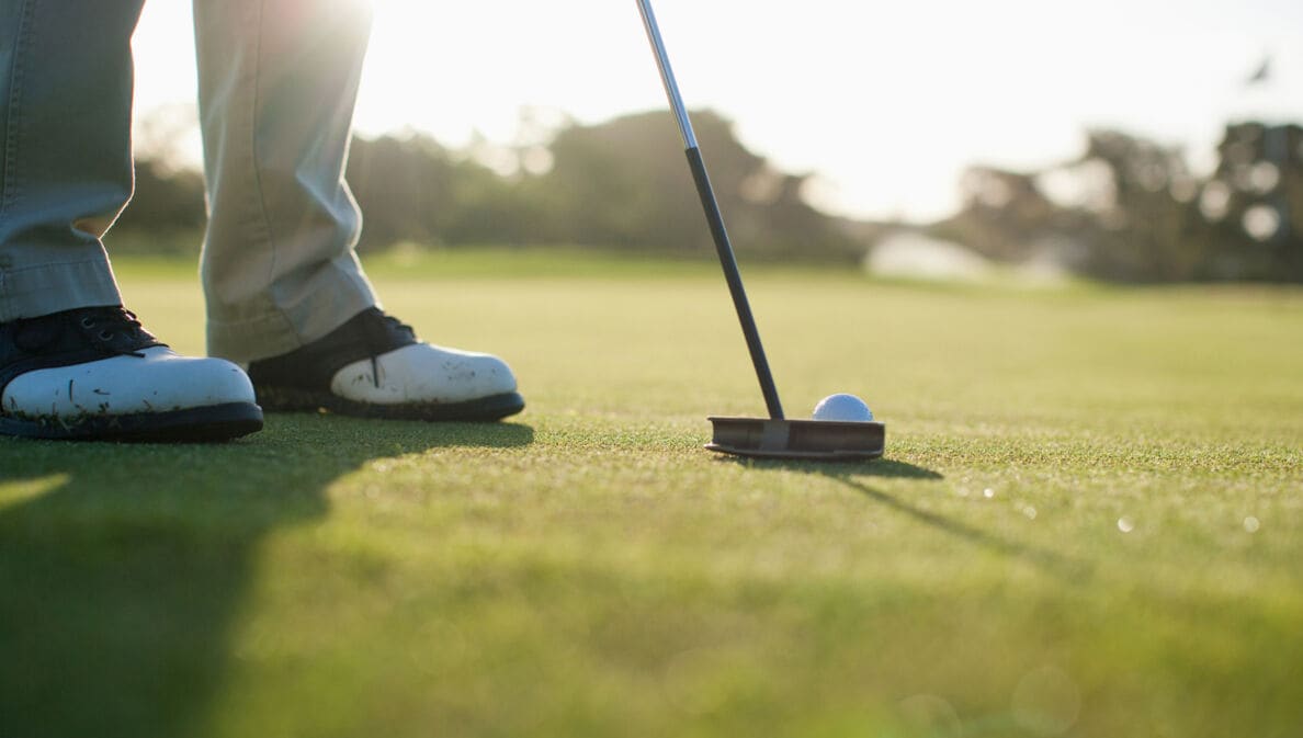 Nahaufnahme von einem Golfschläger, dahinter ein weißer Golfball auf einem grünen Rasen
