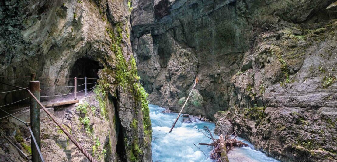 Ein Wanderweg führt über einen Steg und durch einen Tunnel durch die Partnachklamm