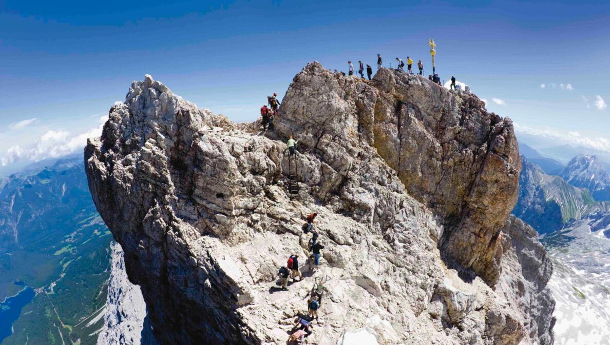 Denn der letzte Abschnitt hat es in sich. Er ist sehr steil, der Weg teilweise mit losem Geröll bedeckt, einige Stellen sind ungesichert über einem Abgrund. Doch das Ziel ist nah: der Ostgipfel der Zugspitze auf 2.962 Metern Höhe. Der Ausblick macht die Mühen der strapaziösen Bergtour wett. Ins Tal zurück geht es entweder über dieselbe Route – oder ganz kommod mit der Zugspitzbahn.