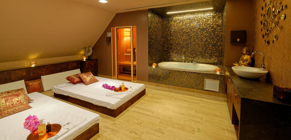 Wellnessbereich mit Badewanne, Betten und goldenen Dekoelementen