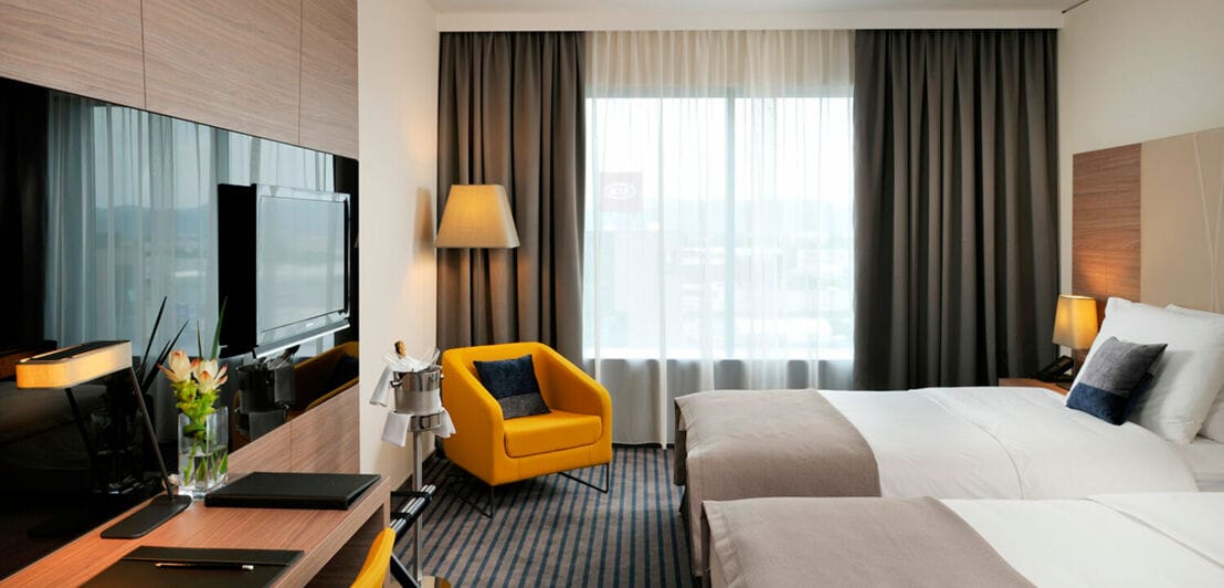 Modernes Hotelzimmer mit Blick auf die Stadt und einen Wald