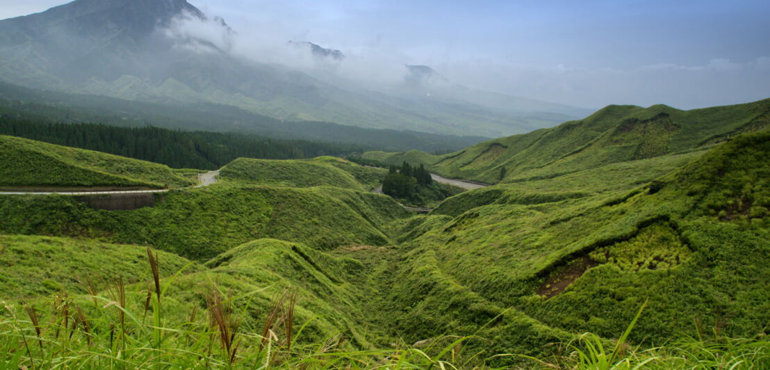 Gebirgige, grüne Landschaft mit einem Vulkan im Hintergrund