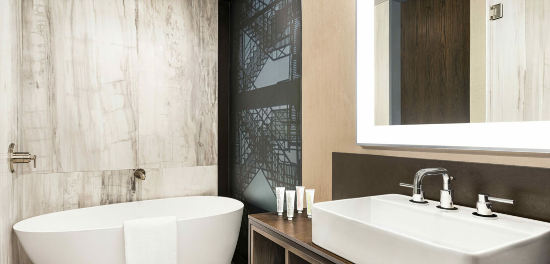 Hotelbad mit weißer, freistehender Wanne, weißem Wachbecken, und Spiegel