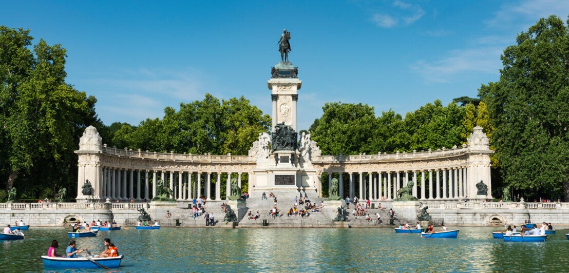 - Parque del Retiro: Nur wenige Meter weiter befindet sich eine weitere grüne Oase Madrids. Der Parque del Retiro lädt auf einer Fläche von etwa 1,4 Quadratkilometern zu ausgiebigen Spaziergängen ein. Der Zugang zum Park ist allerdings nicht kostenfrei. Zur Pflege und Instandhaltung der großen Anlage wird ein Eintrittsgeld verlangt.