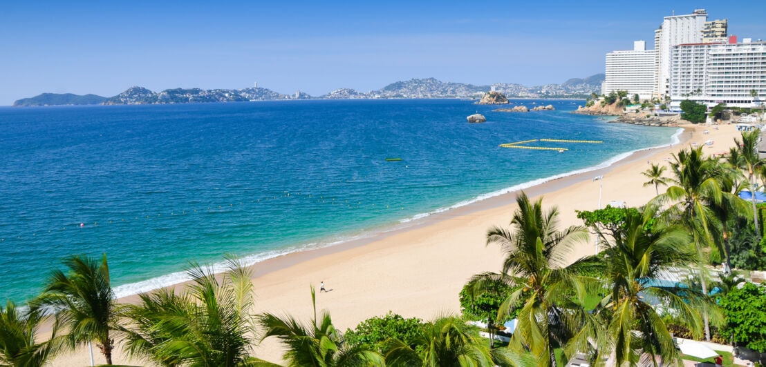 Der Badeort Acapulco an der mexikanischen Pazifikküste ist legendär. Trotz vieler Besucher:innen finden alle an den langgezogenen Stränden einen Platz und können dort den Blick über die Berge der Sierra Madre schweifen lassen.