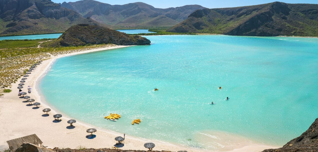 Dieser Strand befindet sich in der Nähe der Stadt La Paz im Nordosten des Landes und fasziniert Jahr für Jahr seine Besucher:innen: Er gilt als Naturparadies, umgeben von einer geschützten Hügellandschaft. Die Playa Balandra besteht aus einer Reihe von Buchten; der Sand blendet fast, so weiß wirkt er. Das Wasser ist kristallklar, flach und warm.