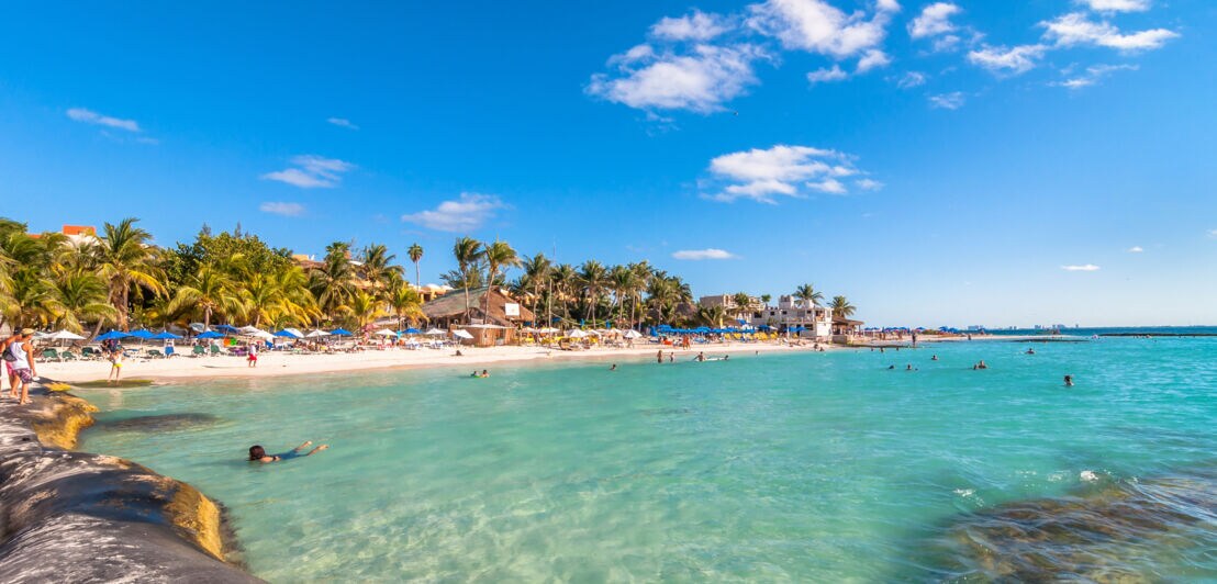 Zu den schönsten Strandabschnitten des Landes zählt die Playa Paraíso in Tulum. Der Sand ist weiß und palmengesäumt, das Wasser azurblau, für Unterhaltung sorgen Beachclubs, und auch an Duschen und Toiletten fehlt es nicht.
