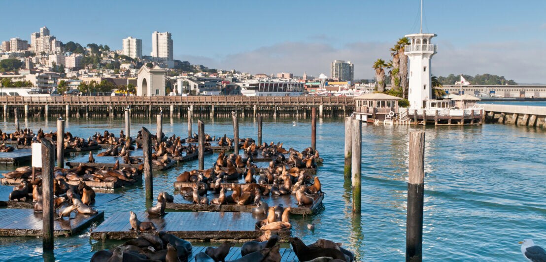 Wenn du mit der Fähre von Alcatraz zurückkommst und an Pier 33 landest, ist es nur ein Katzensprung bis zum bekanntesten Bootsanleger der Stadt: zum Pier 39 in San Francisco, genau genommen im Viertel Fisherman’s Wharf.