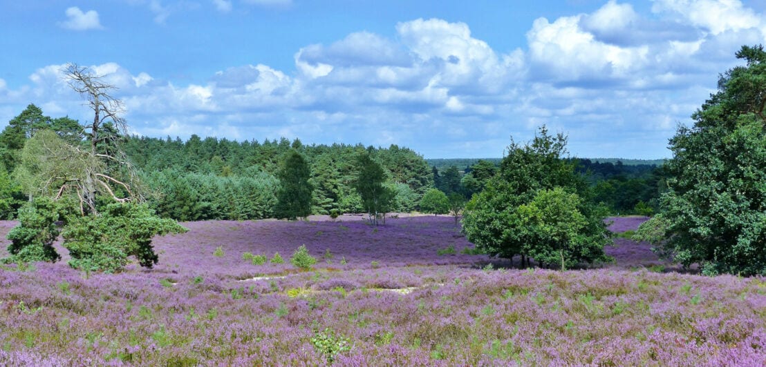 Wie unterschiedlich Heidelandschaften sein können, zeigt im Vergleich der Naturpark Dübener Heide in Sachsen-Anhalt. Du findest kaum offene Flächen, es handelt sich um eine von Mischwald geprägte Landschaft mit Kiefern, Buchen und Eichen. Doch auch hier blüht auf dem charakteristischen Sandboden das typische Heidekraut.