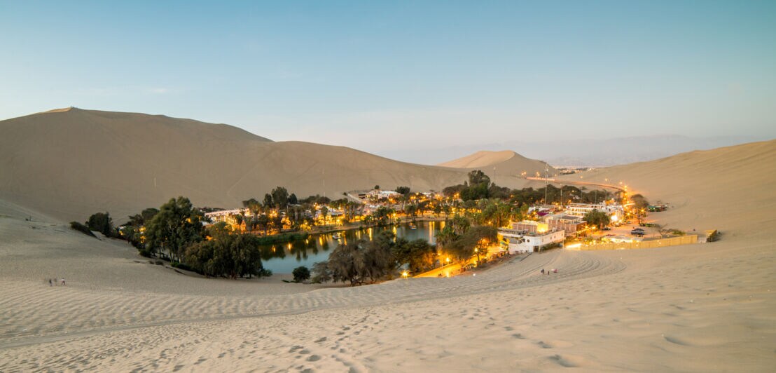 Rund vier Autostunden von Lima entfernt liegt inmitten der Wüste die Oase Huacachina. Der palmengesäumte Ort ist von riesigen Dünen umgeben, die sich teilweise bis zu 100 Meter hoch türmen und zu sportlichen Aktivitäten einladen: Beim Sandboarding schwingst du dich wie beim Surfen die Sandhänge hinab oder erkundest die Gegend bei einer Buggytour.