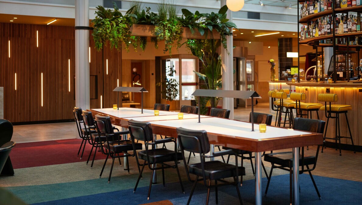 Langer Tisch mit Stühlen in einer Hotel-Lobby, im Hintergrund eine beleuchtete Bar