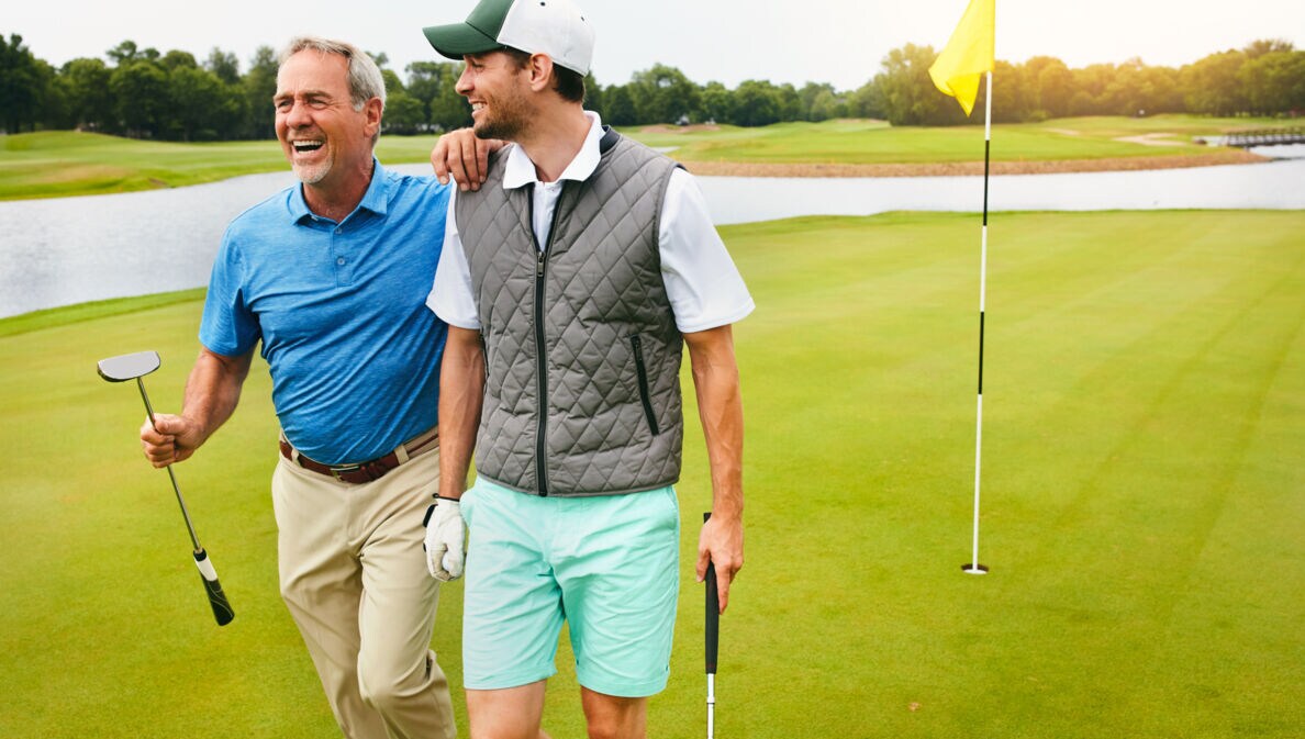Zwei Golfspieler laufen über einen Golfplatz und lachen