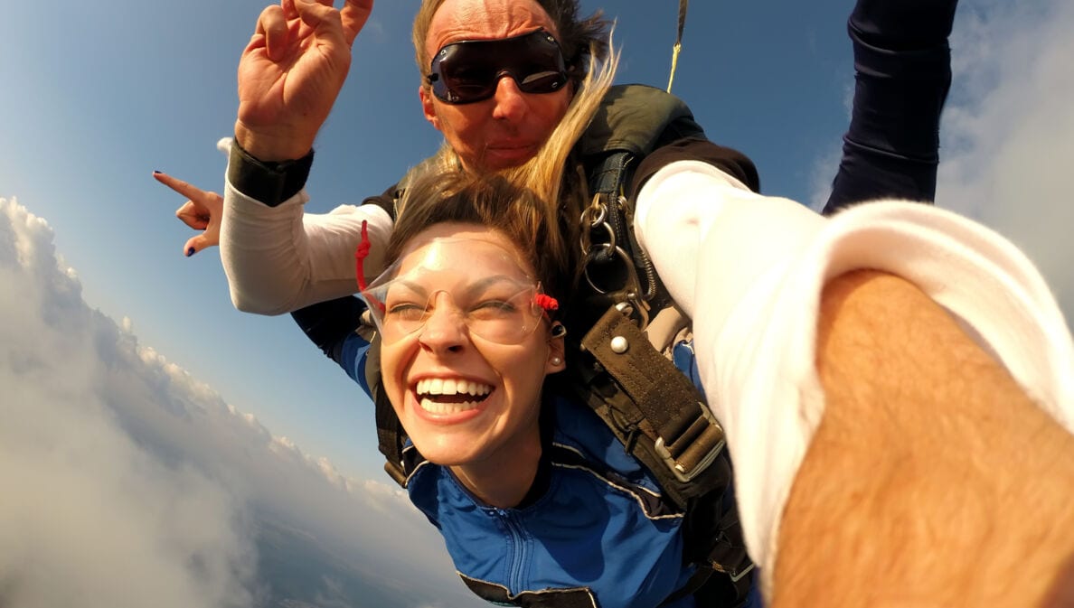 Ein Mann und eine fröhliche Frau beim Tandem-Fallschirmspringen.
