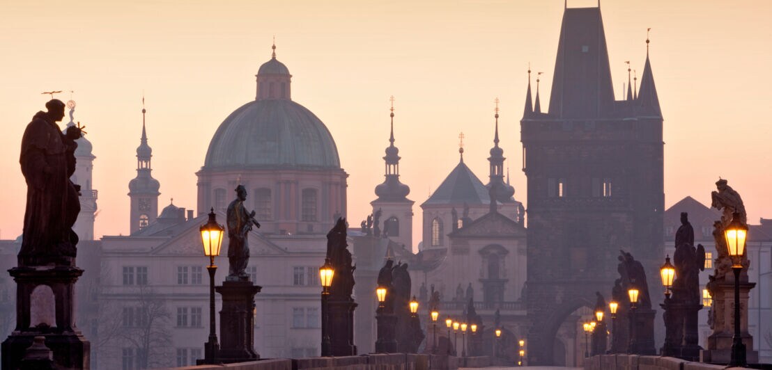 Prags berühmteste Attraktion, die Karlsbrücke, verbindet die Altstadt mit der Prager Kleinseite. Gesäumt wird die Brücke von 30 Statuen, die jeweils für eine:n Heilige:n stehen.