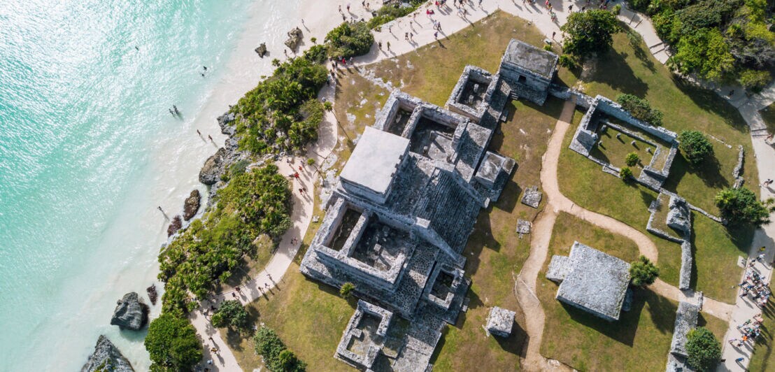 An der Ostküste am Karibischen Meer befindet sich Tulum, eine der letzten großen Maya-Stätten Mexikos vor der spanischen Eroberung. Die direkte Klippenlage der Ruinenstätte, einst strategisch gewählt, bietet heute einen traumhaften Blick über das türkisfarbene Wasser. Ein Besuch verbindet so beeindruckende Ruinen, mexikanische Geschichte und Kultur direkt am Meer.