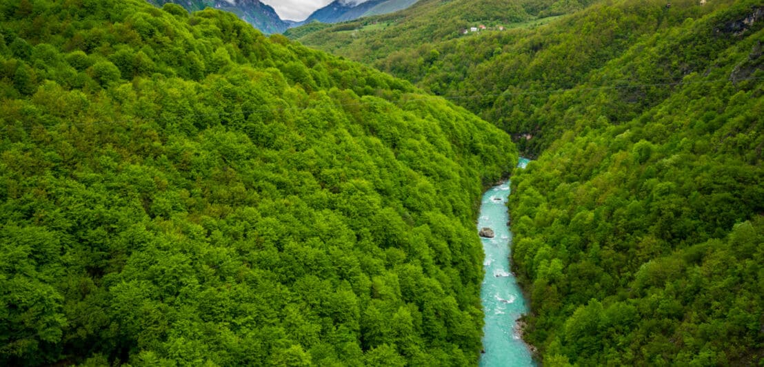 Ein türkisfarbener Fluss fließt durch ein grün bewaldetes Gebirge