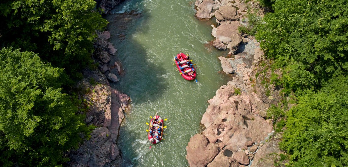 Luftaufnahme zweier Raftingboote in einem Fluss zwischen Felsen und Bäumen