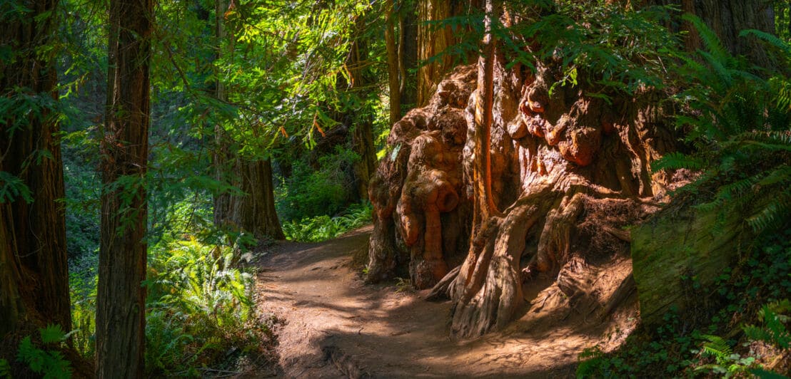Ein Wanderweg führt durch einen dichten Wald entlang einer Mammutbaumwurzel