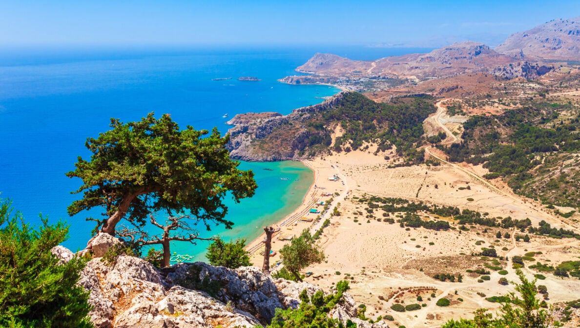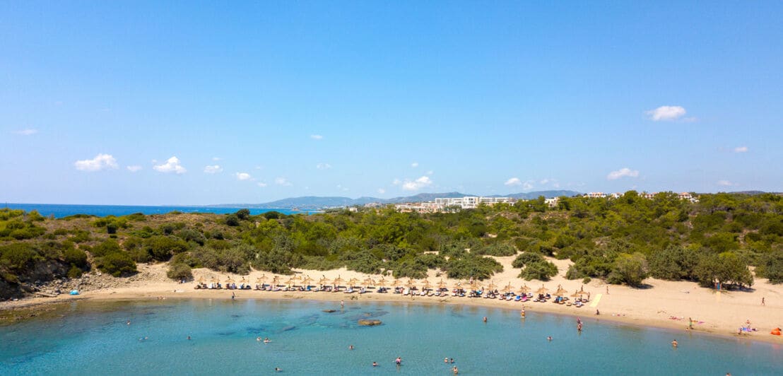 Türkisblaues Wasser, feiner, goldgelber Sand und eine malerische Bucht eingerahmt zwischen beeindruckende Bergen – was für eine traumhafte Kulisse! Besonders lohnenswert ist ein kleiner Aufstieg zum Aussichtspunkt: Vom Kloster der Panagia Tsambika genießt du einen atemberaubenden Blick über die Küste von Rhodos und das endlose Blau des Meeres.