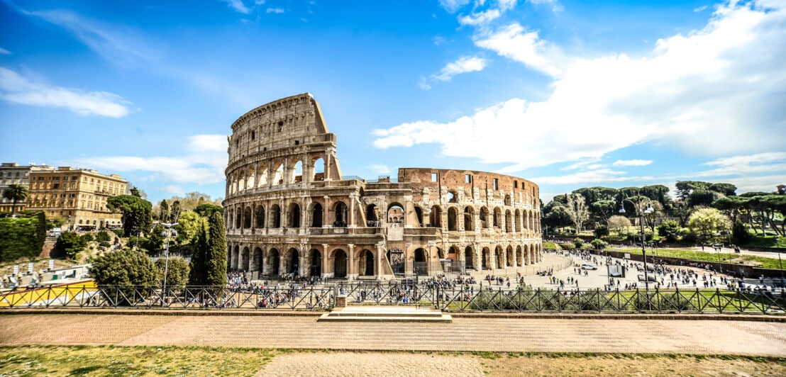 Das Kolosseum („Colosseo“) in Rom ist das größte antike Amphitheater der Welt und wurde im Jahr 80 n. Chr. fertiggestellt. In seiner Anfangszeit diente es hauptsächlich der Unterhaltung des freien römischen Volkes. Das Kaiserhaus lud damals unter anderem zu Gladiatorenkämpfen und Tierhetzen.
