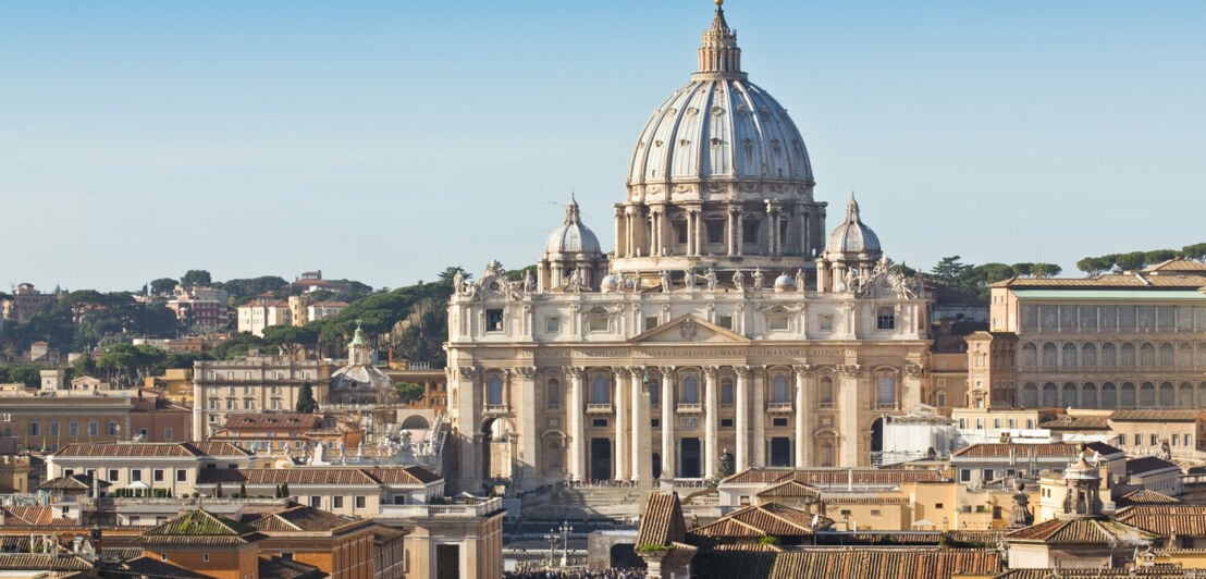 Willst du den Petersdom („San Pietro in Vaticano“) besichtigen, verlässt du Italien und begibst dich auf das Staatsgebiet des Vatikans: Du stehst auf dem weitläufigen Petersplatz und vor dir liegt der Eingang des 1623 fertiggestellten Petersdoms.
