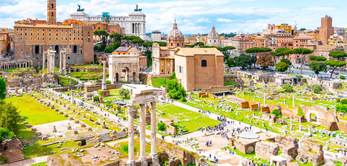 Heute wirkt das Forum Romanum wie eine aus der Zeit gefallene Stadt innerhalb der Stadt, wozu seine besondere Lage beiträgt: Es befindet sich in einer Senke zwischen den Stadthügeln Palatin, Kapitol und Esquilin. Hier bestaunst du antike Säulen, gut erhaltene Tempel, Triumphbögen und Basiliken und fühlst dich für kurze Zeit wie in einer anderen Welt.