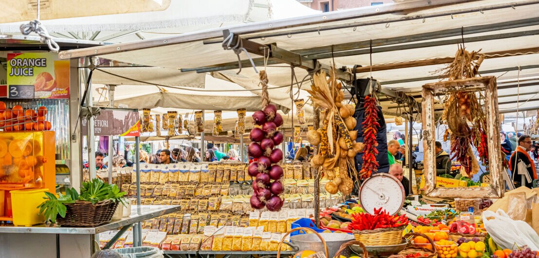 Auf den Campo de’ Fiori lockt täglich, außer sonntags, ein großer, lauter und bunter Wochenmarkt. Dort bieten Händler:innen schmackhaftes Obst und Gemüse, Blumen, Käse, frisches Fleisch, Fisch und Kräuter an.