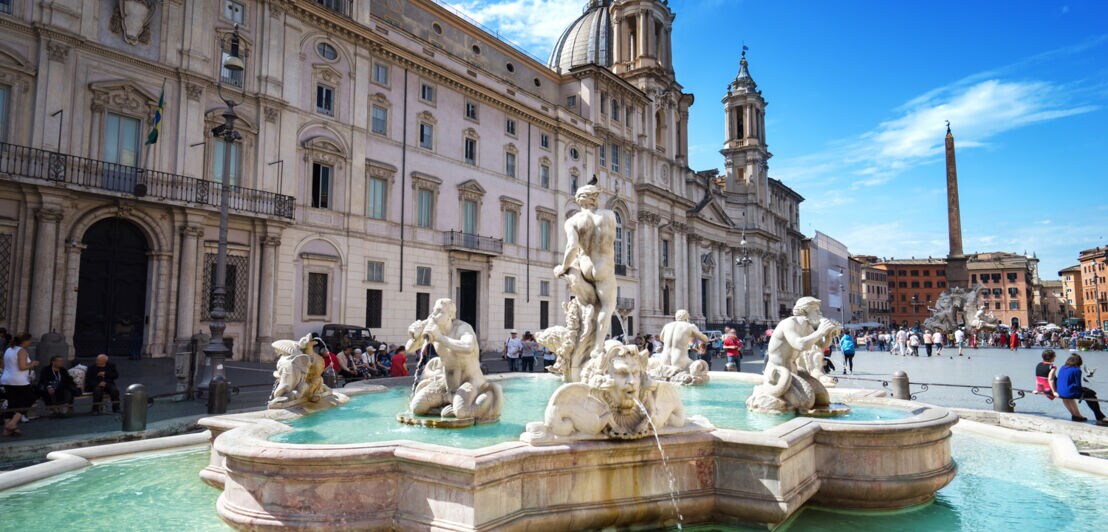 Die Piazza Navona im Stadtviertel Parione ist einer der beliebtesten Treffpunkte Roms. Gleich um die Ecke des Trevibrunnens erstreckt sich der ovale Platz, gesäumt von drei charakteristischen Brunnen, antiken Kirchen, zahlreichen Restaurants und Cafés. Ähnlich wie das Kolosseum war der Platz einst ein Stadion, das zur Unterhaltung des Volkes – allerdings weniger blutig als im Kolosseum – für sportliche Spiele genutzt wurde. Seine Überreste kannst du noch heute unter der Piazza Navona besichtigen.