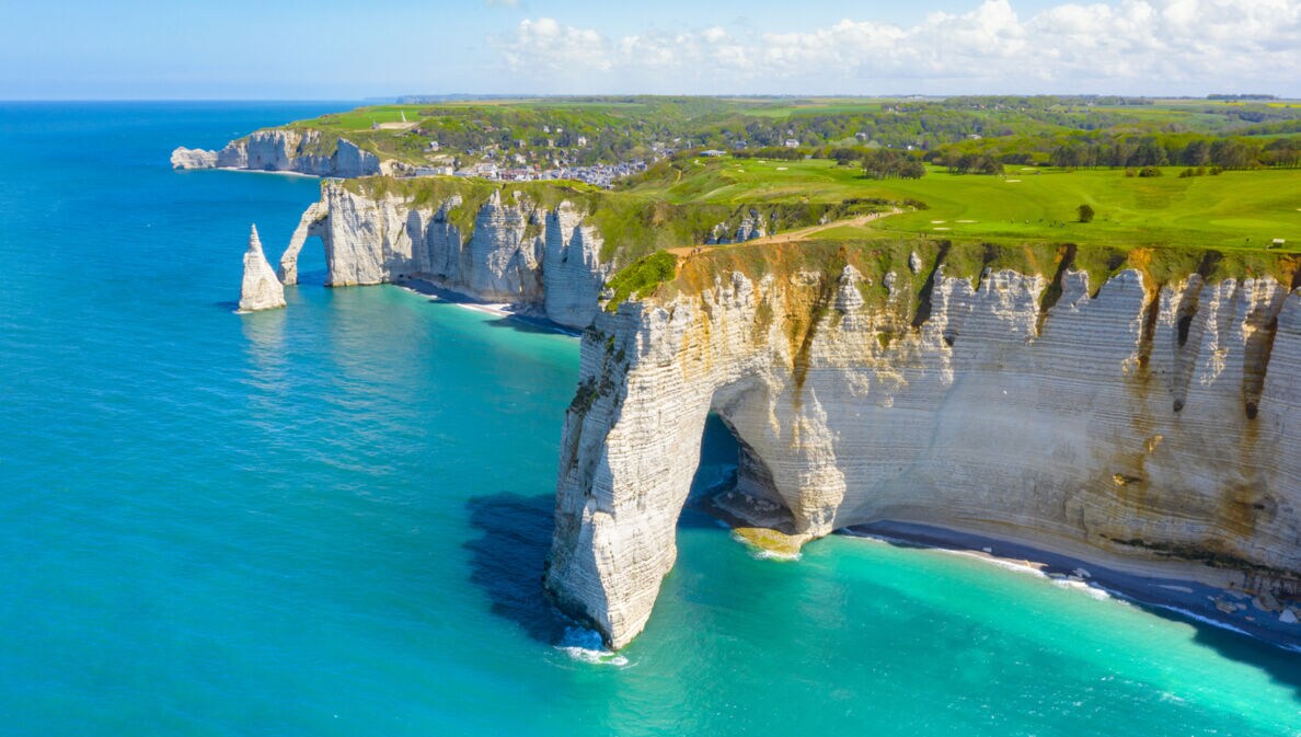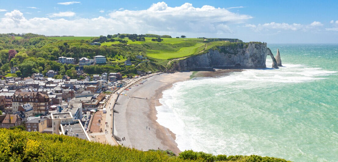 An einem der bekanntesten Urlaubsorte an der Alabasterküste, im Seebad Étretat im Département Seine-Maritime, befindet sich ein wunderschöner Naturstrand. Erosion und Wellen haben einzigartige Strukturen wie Tunnel, Höhlen und Bögen in die weißen Felsen gearbeitet.