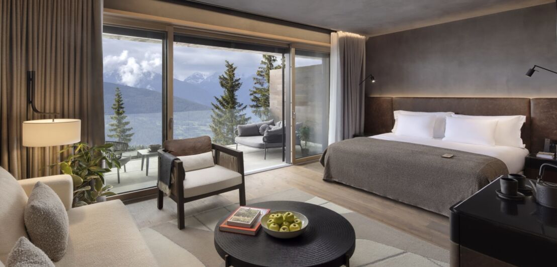 Hotelzimmer mit Designermöbeln, Panoramafenstern und Berglandschaft im Hintergrund