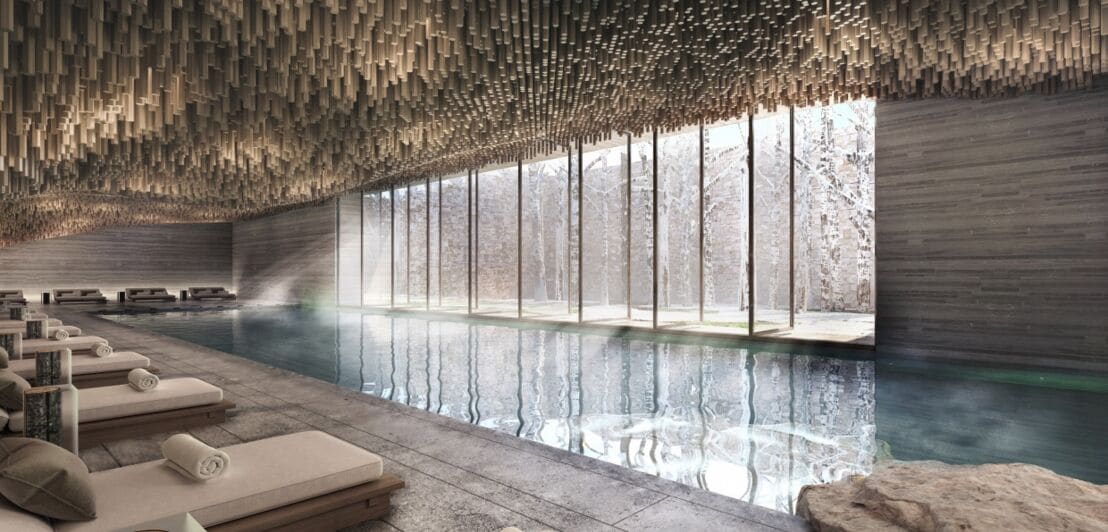 Indoor-Hotelpool mit bodentiefen Fenstern, Liegemöglichkeiten und einer wie Stalaktiten designten Decke.