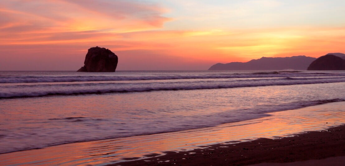 Am Golf von Papagayo im Pazifischen Ozean liegt im Norden Costa Ricas die einsame Playa Naranjo in fantastischer Kulisse. Der weiße Sandstrand mit kristallklarem Wasser inmitten der wilden Mangrovenwälder des Nationalparks Santa Rosa ist zwar recht schwer zu erreichen, wer es dennoch dorthin schafft, wird mit einem tollen Fotomotiv belohnt: Aus dem Wasser ragt ein markanter Felsbrocken, der Witches Rock oder auch Roca Bruja genannt wird.