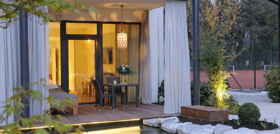 Der Wellnessgarten im oberbayerischen Waging am See war erst nur eine Saunalandschaft, ehe 2014 mit dem Hotel Übernachtungsmöglichkeiten in 13 Zimmern und zwei Suiten hinzukamen. Wer hier eine Unterkunft bucht, kann seiner Leidenschaft im nahe gelegenen Tenniscamp von Inhaber Sepp Baumgartner nachgehen, das wirklich keine Wünsche offen lässt.