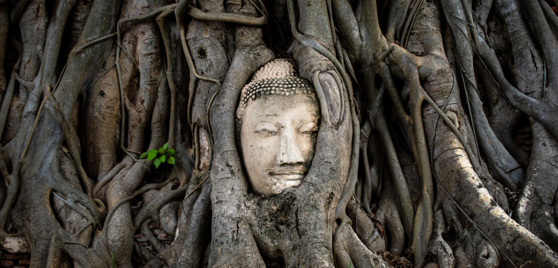 Die Stadt Ayutthaya in der Nähe von Bangkok war ab 1351 rund 400 Jahre lang die Königsstadt des alten Reichs Siam. Im historischen Herz der modernen Großstadt, inmitten eines Geschichtsparks mit verwunschenen Ruinen, erhebt sich ein Buddhatempel, der auf keiner Thailandreise fehlen sollte: Wat Mahathat.
