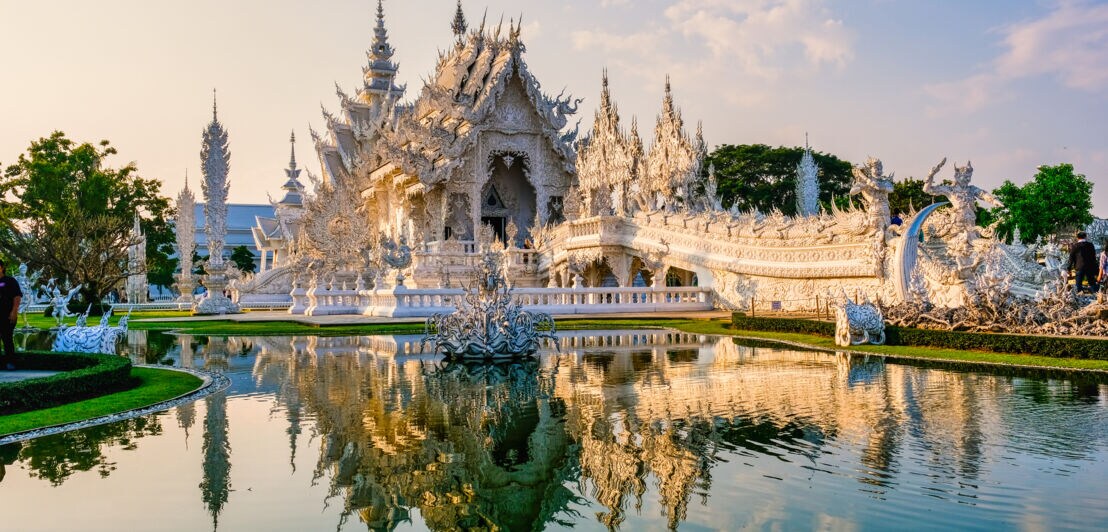 Filigran und märchenhaft wirkt Wat Rong Khun, der weiße Tempel in der Provinz Chiang Rai. Ein sagenhaftes, absolut sehenswertes Bauwerk – das allerdings kein klassischer Tempel ist, sondern ein privates Kunstwerk, dessen Bau 1997 begann.