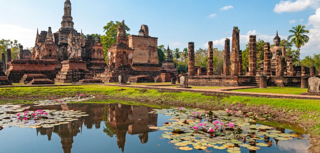 Der Wat Mahathat im Historical Park von Sukhothai in Nordthailand ist nicht zu verwechseln mit der Tempelanlage in Ayutthaya bei Bangkok (siehe oben). In Sukhothai kannst du die Ruinen der Hauptstadt des ersten Königreiches (1238–1438) besichtigen – mit Zierteichen, dem Palast, Festungswällen und Wassergräben.