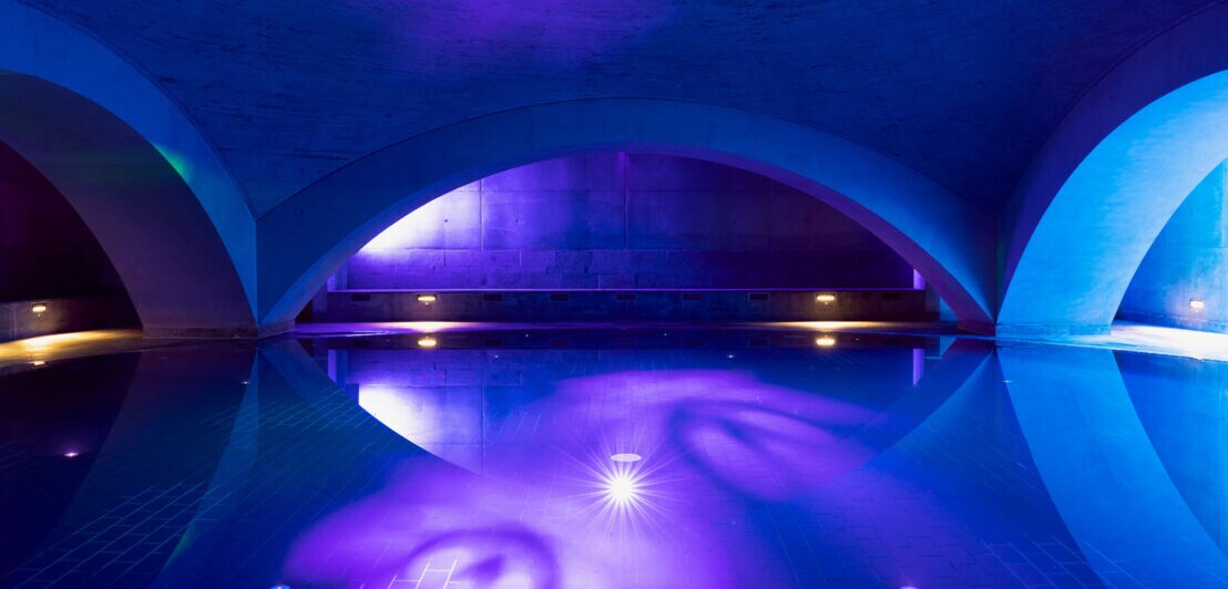Minimalistisches Wasserbecken mit Rundbögen und blau-violetter Beleuchtung