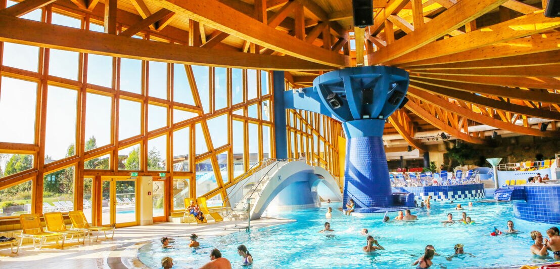 Innenaufnahme eines Thermalbades in einem Gebäude aus Holz mit Personen im Pool