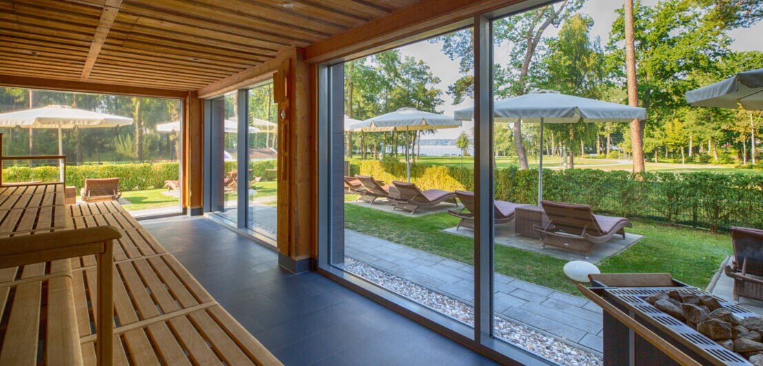 Eine Holzsauna mit Blick in einen Garten mit Liegen an einem See