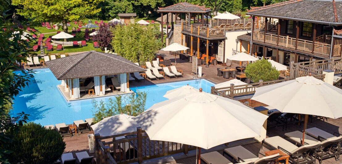 Saunalandschaft mit Pool und Liegen im balinesischen Stil