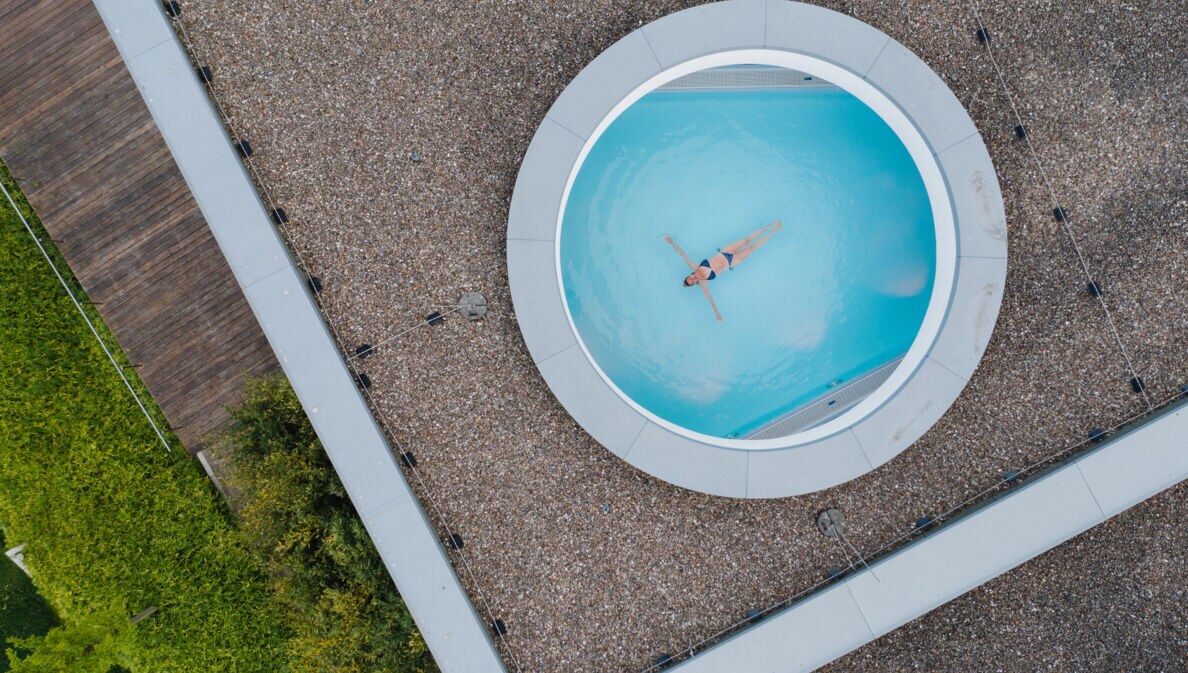 Eine Frau schwebt mit ausgestreckten Armen in einem Pool, fotografiert durch ein rundes Dachfenster aus der Vogelperspektive
