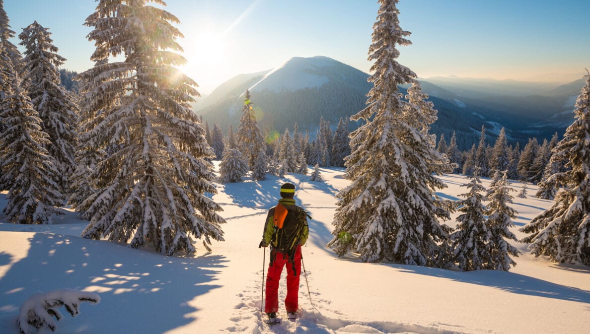 Ein Schneeschuhwanderer auf einem Berg zwischen beschneiten Tannen